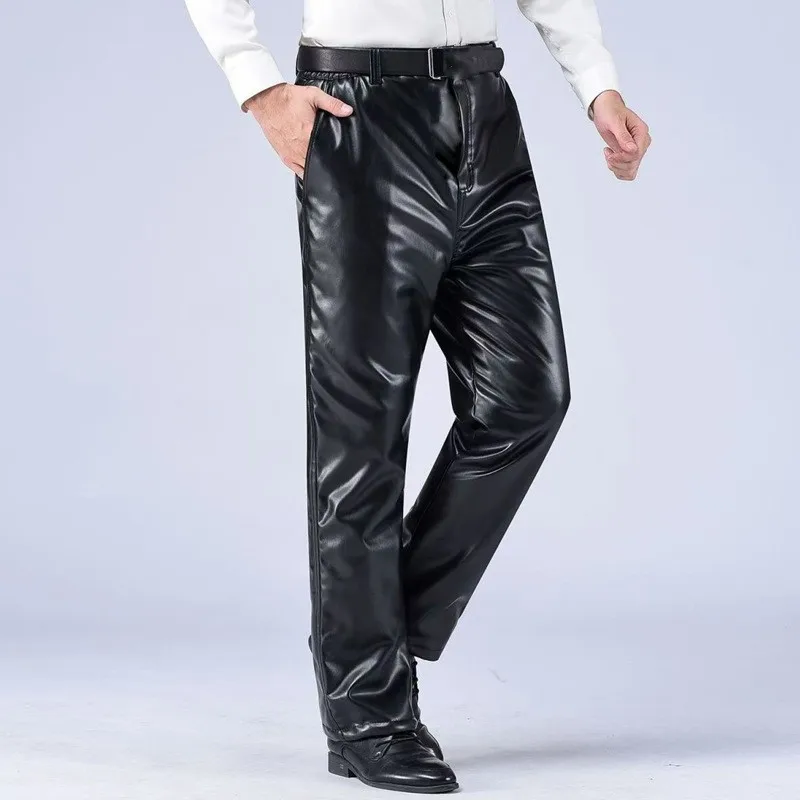 Men's PU Leather Pants Elastic Waisted Loose Casual Straight Trousers Windproof Warm Leather Pants
